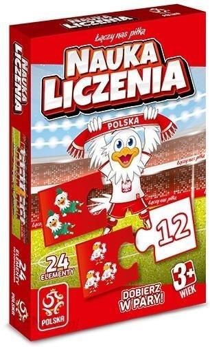 Gra planszowa na licencji PZPN – dobierz w pary! Układanka edukacyjna dla jednego gracza. Polega na połączeniu w pary dwóch puzzli, jednego z cyfrą i drugiego z odpowiadającą mu ilością obrazków o tematyce piłkarskiej.W zestawie: 24 elementy.